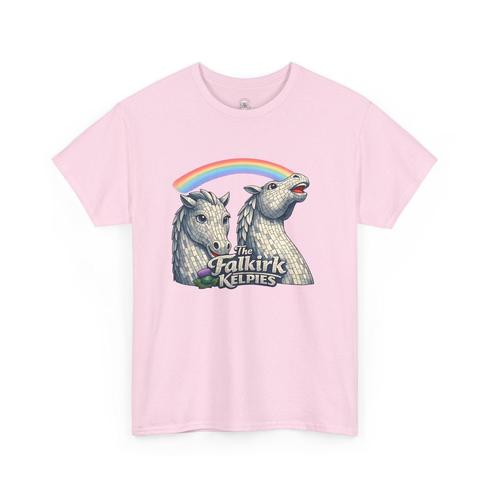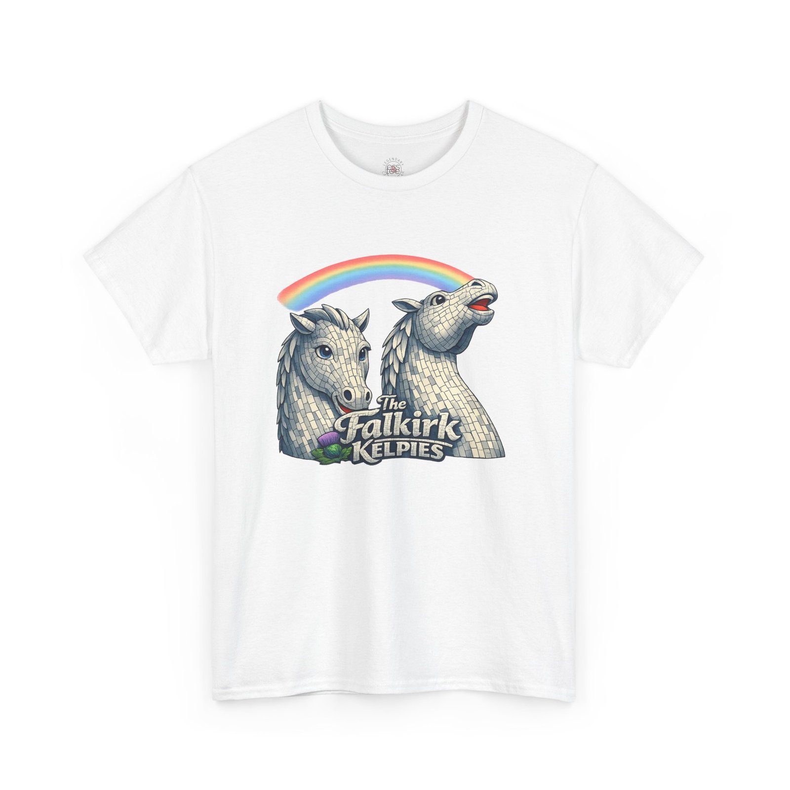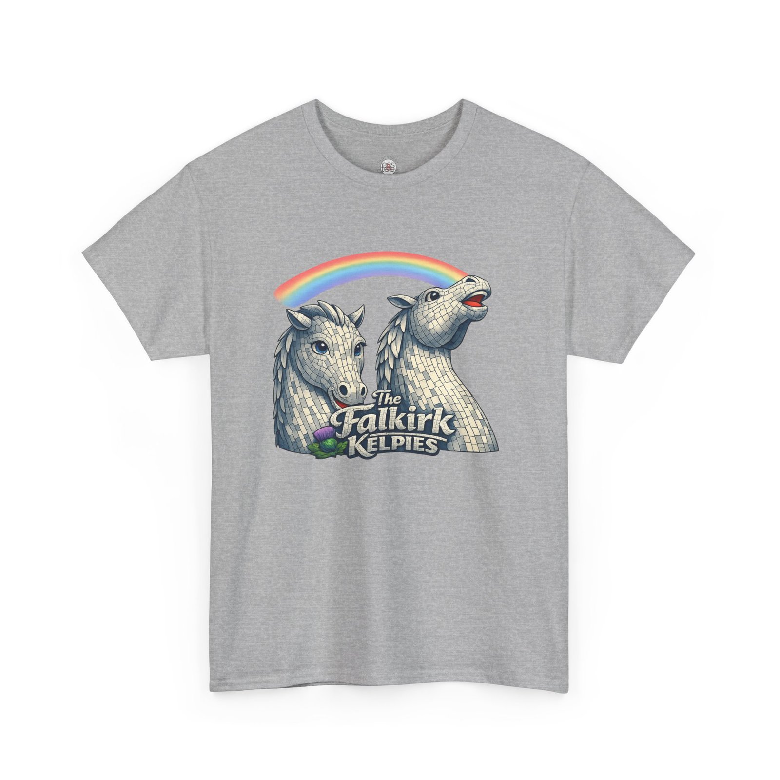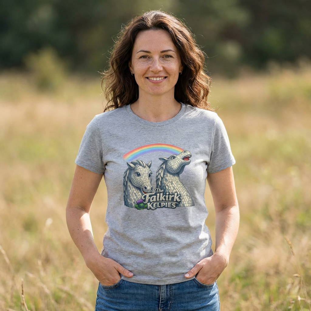 This cotton tee wears like a comfortable companion on long days and quick adventures. The front print shows two sculpted kelpie heads in soft gray tones, a nod to the Falkirk Kelpies, with a playful rainbow arc that adds a flash of color and personality. The shirt’s relaxed cut and crew neckline sit easily under a jacket or stand alone with jeans. Picture strolling riverside after a festival, chatting about public art, or slipping this on for a museum run — it feels grounded, a little whimsical, and quietly Scottish. The breathable medium-weight fabric and tear-away label keep focus where it should be: on the design and on whatever you’re doing next.